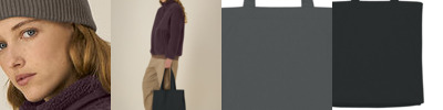 100% Recycled cotton canvas (open end). Woven shopping bag. Folded hem at top edge. Hidden snap closure. Bottom and side soufflé. Long and short self-fabric handles with cross-stitch for reinforcement. Inside self-fabric pocket. Herringbone tape on inside seams for a clean finish. Single-needle stitch at top edge.