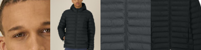 100% Recycled nylon. Men’s padded jacket. Medium fit. Set-in sleeve. High collar with a grown-on hood. Adjustable hood opening and bottom hem with plastic stopper and elastic cord. Reverse nylon zip at centre front. Zipped welt pockets with extra grosgrain puller. Fully quilted. Side panels for a better shape. Self-fabric elasticated cuff. Inside seams with binding finish.